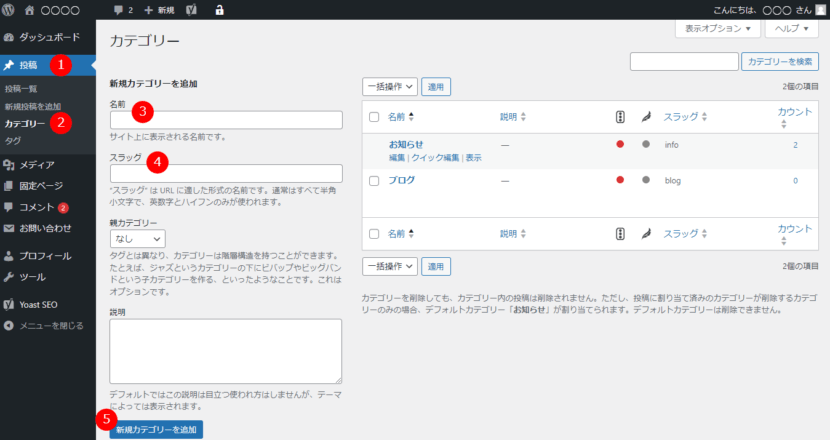 日本語で入力するとSEO対策で不利をなります。 - 「新規カテゴリを追加」をクリック