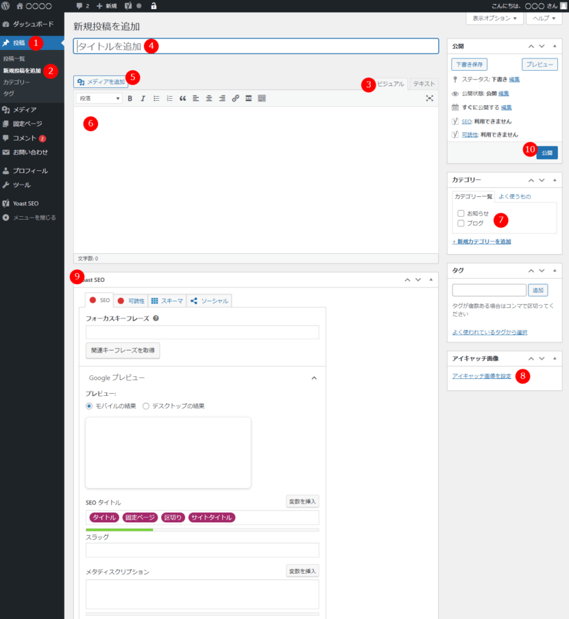 - 「新規投稿を追加」をクリックすると下記の画面が表示されます。