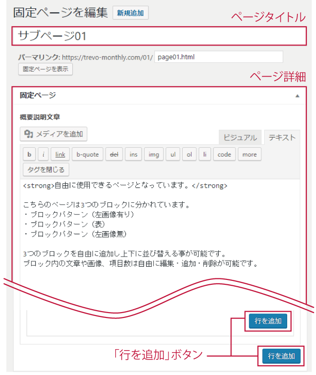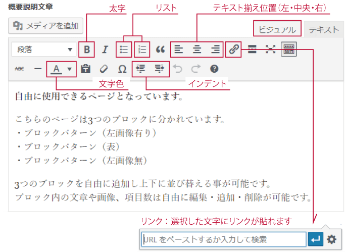ページの説明文章などを入れる場所です。画像の挿入なども可能です。