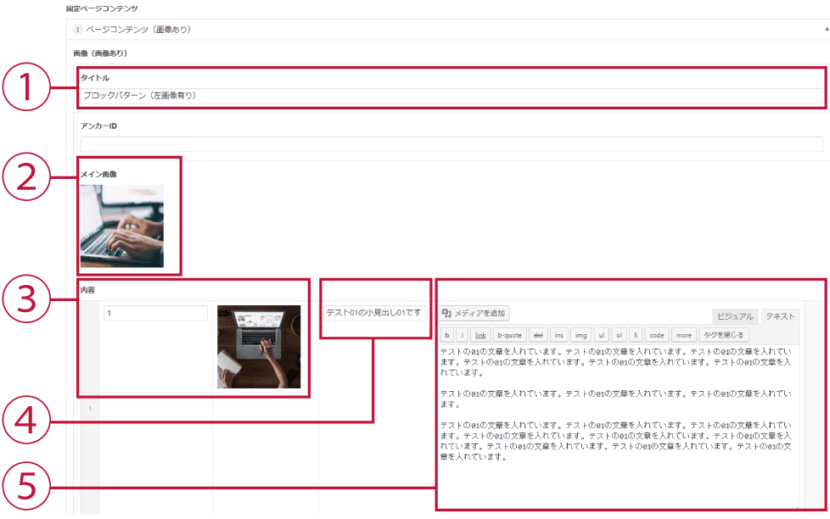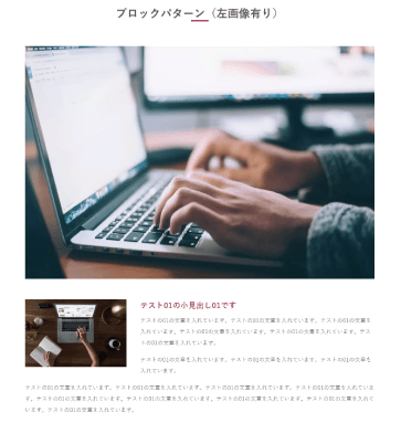 タイトル、画像の下に左に画像、右にタイトルと文章を入れる複製が可能な入力ボックスのセットです。