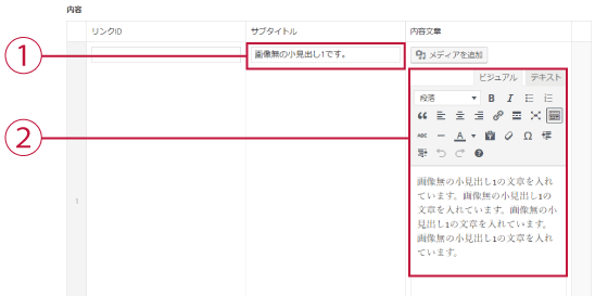 タイトル、画像の下にタイトルと文章を入れる複製が可能な入力ボックスのセットです。